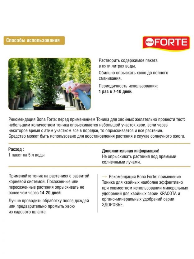 Представляем удобрение "Тоник" для хвойных растений от Bona Forte — идеальное решение для поддержания здоровья и роста ваших зеленых питомцев. Это минеральное удобрение в форме порошка разработано специально для хвойных культур, чтобы обеспечить их всеми необходимыми витаминами и стимулировать рост в весенний, летний и осенний сезоны.