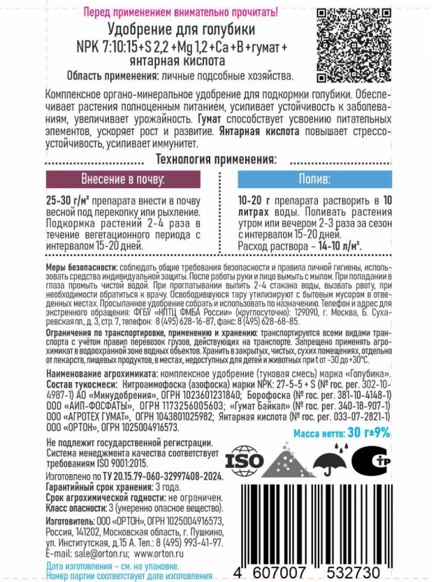 Удобрение Ортон Тукосмесь для голубики 30 г — быстрый рост и богатый урожай ягод уже в первый сезон, подходит для дачи и домашних посадок.