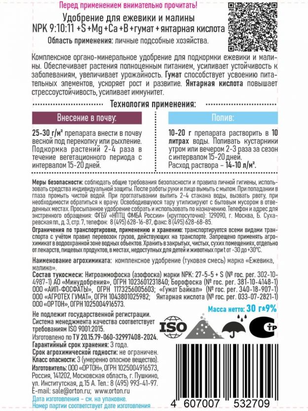 • Специализированная органоминеральная формула — максимум пользы для малины и ежевики, оптимальное питание на весь сезон.