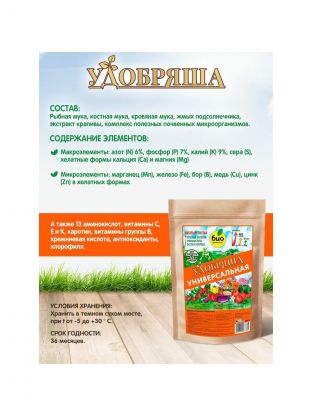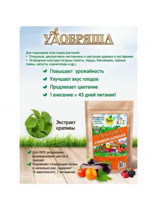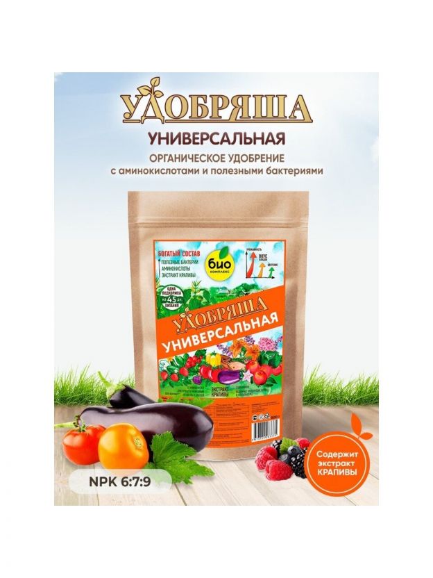 "Удобряша"– это органическое удобрение с аминокислотами и полезными почвенными бактериями. Универсальный состав подкормки подходит для всех видов растений.