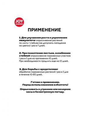Удобрение Уксус древесный Joy Garden — спрей для плодово-ягодных культур, который обеспечивает надежную защиту от болезней и вредителей, а также стимулирует активный рост растений. Идеально подходит для применения весной и летом в открытом грунте. Объем 550 мл позволяет обработать значительную площадь сада. Выгода: повышение урожайности и крепкое здоровье растений.