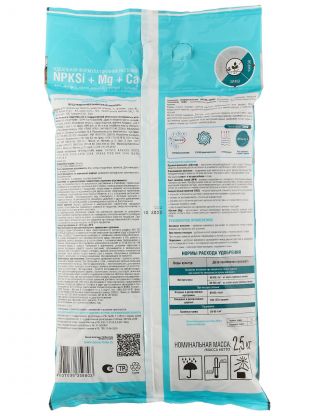 - Экономичная упаковка 2.5 кг в гранулах — легко дозировать, хватает на большие площади, подходит для газонов и плодовых деревьев.