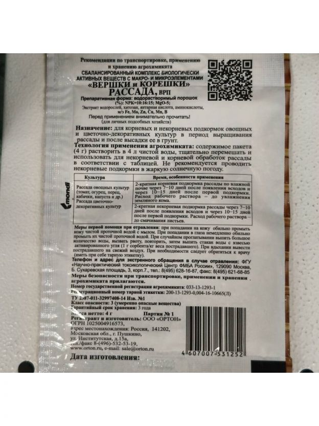Удобрение Вершки и корешки Рассада, регулятор роста, органоминеральное, порошок, 4 г, Ортон