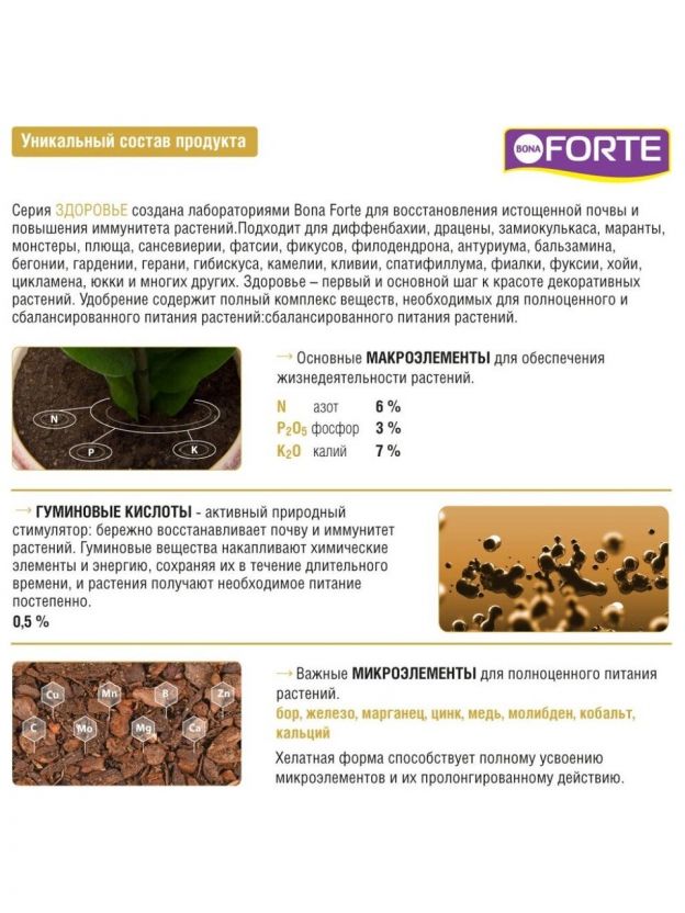 Современный ритм жизни требует простых и надежных решений для поддержания уюта и красоты дома. Удобрение Bona Forte помогает добиться пышного цветения, насыщенного цвета листьев и активного роста растений без лишних хлопот. Продукт подходит для любого сезона: весна, лето, осень и зима. Применение удобрения позволяет поддерживать декоративные качества растений даже в условиях ограниченного освещения и сухого воздуха, характерных для городских квартир.