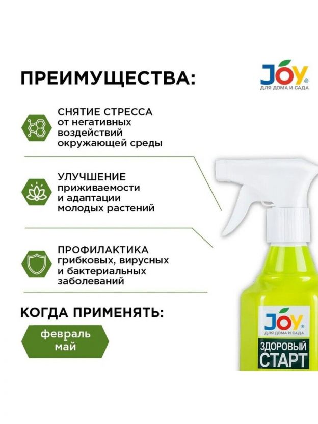 Удобрение стимулирует активный рост, улучшает приживаемость и адаптацию молодых растений. Joy служит для профилактики грибковых, вирусных и бактериальных заболеваний и снимает стресс от негативных воздействий окружающей среды. Не содержит гормонов роста.