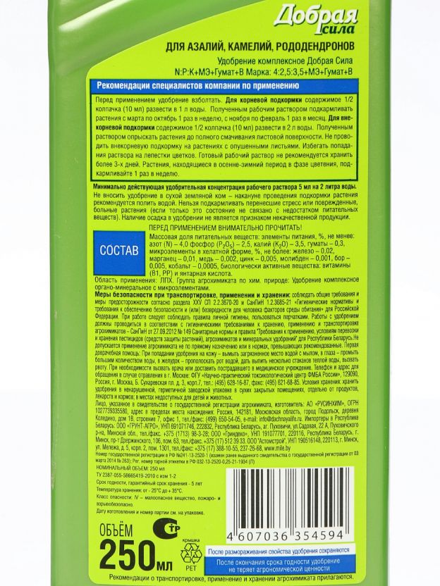Удобрение Добрая сила для азалий, камелий и рододендронов: 250 мл концентрата для пышного цветения и здоровых листьев — заботьтесь о любимых растениях легко!