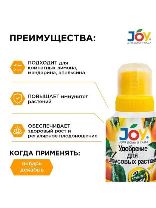 Жидкое удобрение Joy для цитрусовых растений содержит комплекс веществ, необходимый для полноценного питания в легкодоступной форме. Оно станет отличным помощником цветоводу и садоводу в выращивании культур как в квартире, так и в саду.