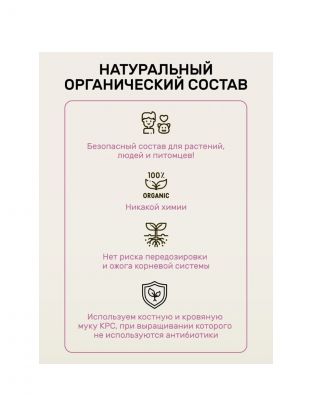 Органическая формула не накапливает соли в почве, подходит для всех видов декоративных растений и безопасна для людей и домашних животных. Упаковки хватает на длительный срок.