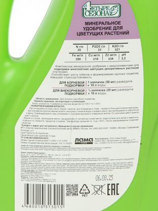 Удобрение Четыре сезона — оптимальный выбор для тех, кто ищет, какое удобрение лучше для цветущих растений в домашних условиях или на даче. Благодаря жидкой форме питательные вещества быстро усваиваются корнями, что обеспечивает заметный результат уже через 1-2 недели регулярного применения. Это особенно важно для тех, кто спрашивает, как использовать удобрение для пышного цветения и как ухаживать за цветами без лишних усилий.