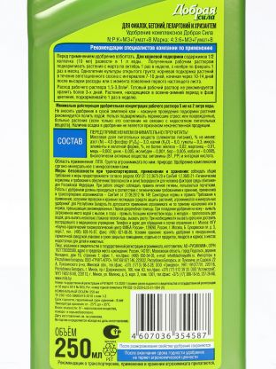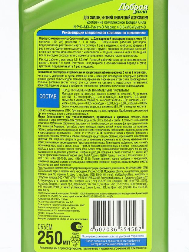 Добрая сила — это минеральное жидкое удобрение, созданное специально для фиалок и бегоний. Жидкая форма обеспечивает равномерное питание и быстрое действие, а фасовка 250 мл удобна для длительного использования.
