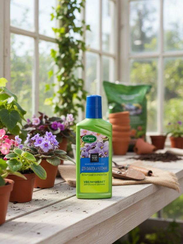 Жидкая форма позволяет точно дозировать средство, быстро доставляет питательные вещества к корням и снижает риск перекорма. Это особенно важно для нежных фиалок и бегоний, требующих деликатного ухода.
