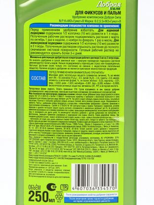 Удобрение для фикусов и пальм, минеральное, жидкость, 250 мл, Добрая сила