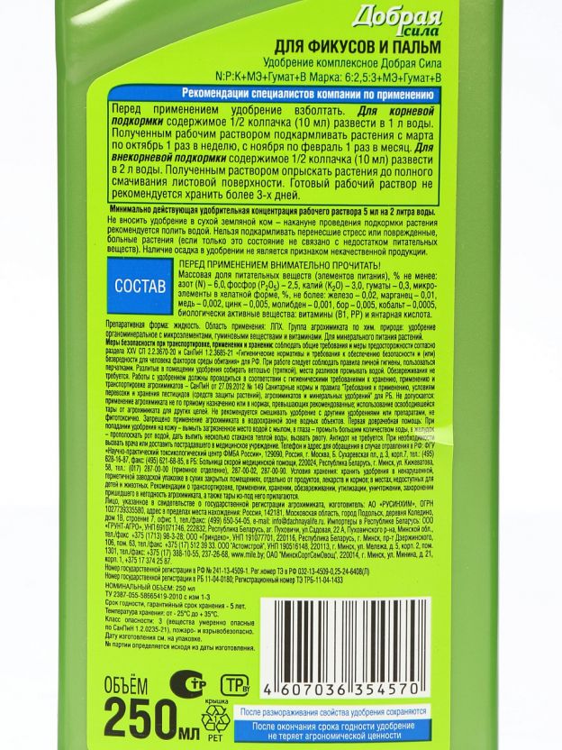 Объем 250 мл рассчитан на сезон (до 50 поливов). Разбавьте 5 мл удобрения в 1 л воды и поливайте растения 1-2 раза в месяц в период активного роста.