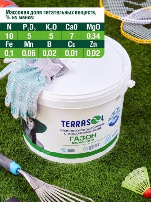 Сезоны весна и лето – это время, когда газон требует особого ухода и внимания. Удобрение «Террасол» помогает обеспечить все необходимые питательные вещества для активного роста и укрепления травяного покрова. Благодаря удобной форме выпуска в ведре весом 10 кг, его легко использовать и хранить.