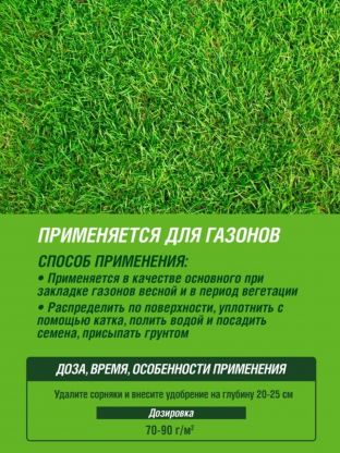 • обеспечивает насыщенный зеленый цвет: благодаря специально подобранному составу, трава приобретает яркий и здоровый вид;