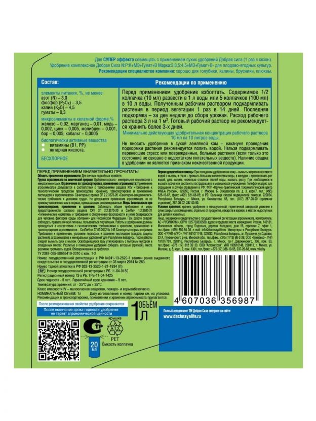Удобрение для голубики и лесных ягод, канистра, ОМУ, жидк, 1л, Добрая сила — идеальное решение для активного роста и обильного плодоношения голубики и клюквы на даче или в саду. Органоминеральная жидкая форма быстро усваивается, стимулирует корнеобразование и повышает урожайность. Применение весной и летом обеспечивает здоровое развитие растений и максимальный сбор ягод.