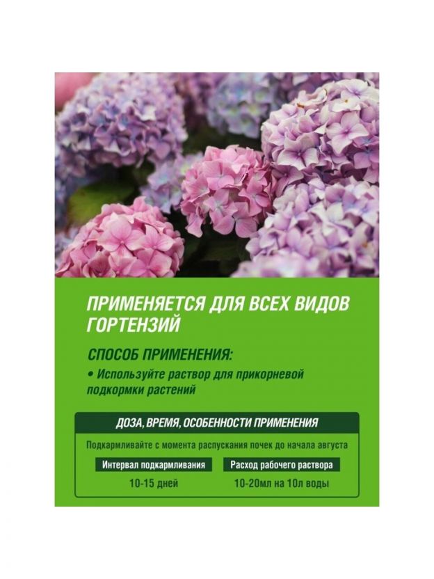 Подкормку производят раствором удобрения 12 мл удобрения на 1л воды, 8-10 л на 1м2. Гортензия является растением, предпочитающим влажную почву, поэтому ей требуется тщательный и обильный полив. Подкорм растения проводят с момента появления почек, с перерывом 10-15 дней, в начале августа подкормку прекращают.