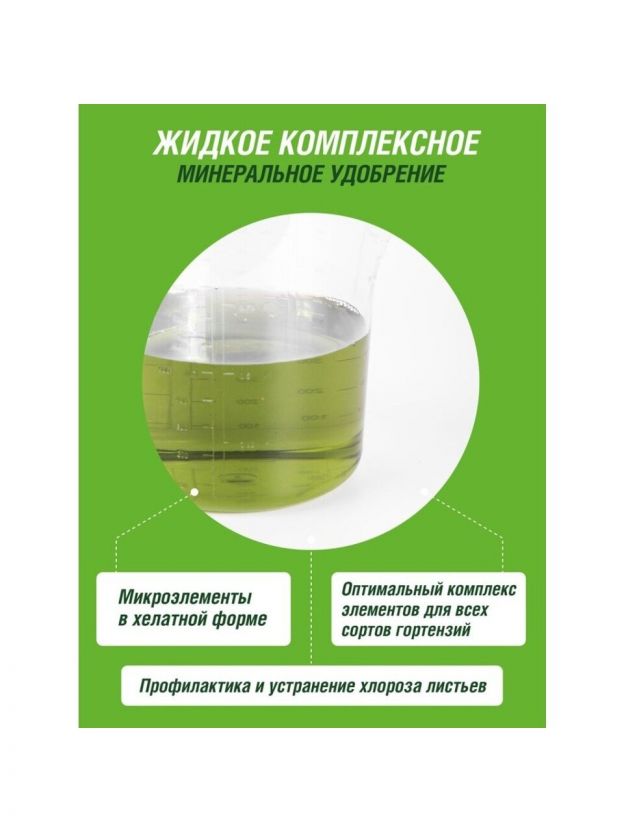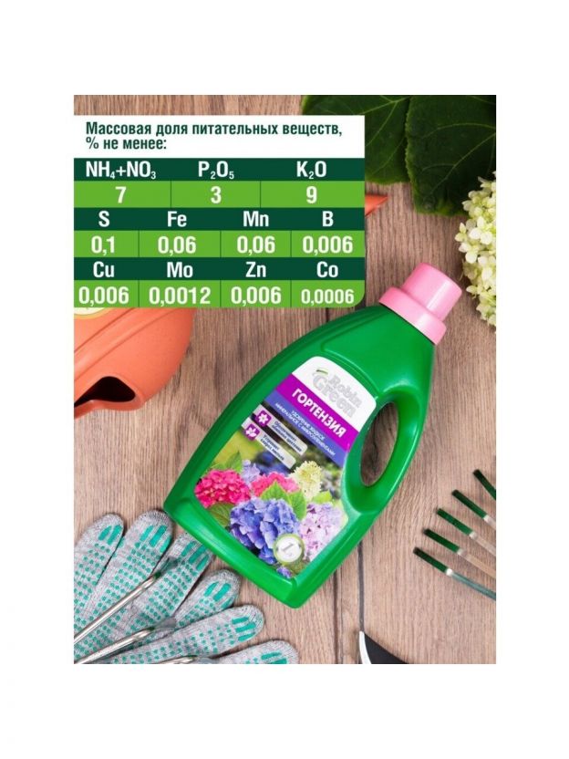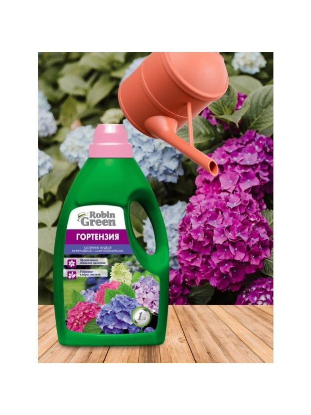 Жидкое удобрение для гортензий Robin Green - комплексное и концентрированное удобрение с микроэлементами, подходит для всех видов гортензий. Препарат насыщен оптимальным набором микро- и макроэлементов в легкодоступной форме.