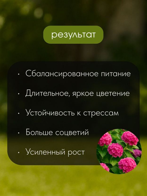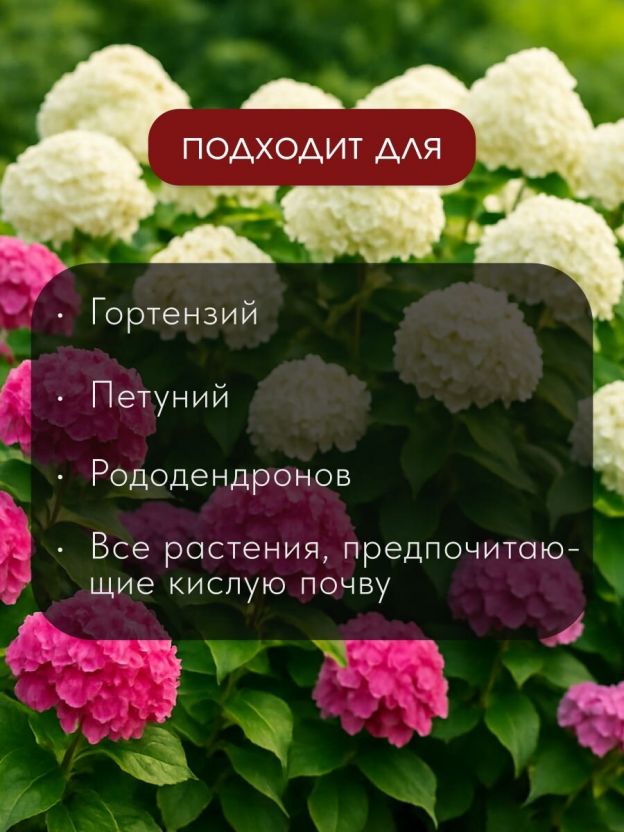 Подходит для гортензий, рододендрон, голубики, хвойных и других растений, требующих кислую почву.