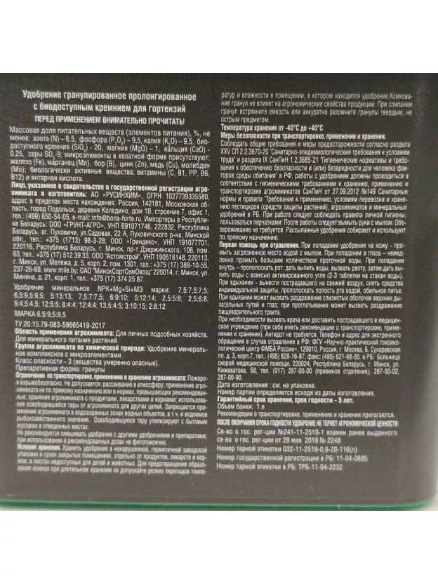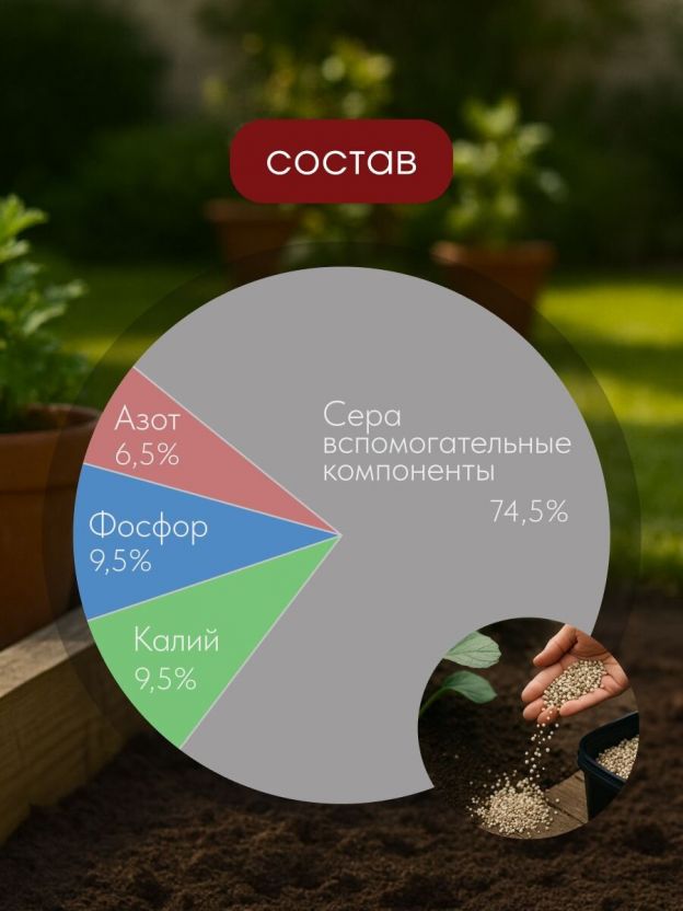Содержание: азот 6,5%; фосфор 9,5%; калий 9,5%.