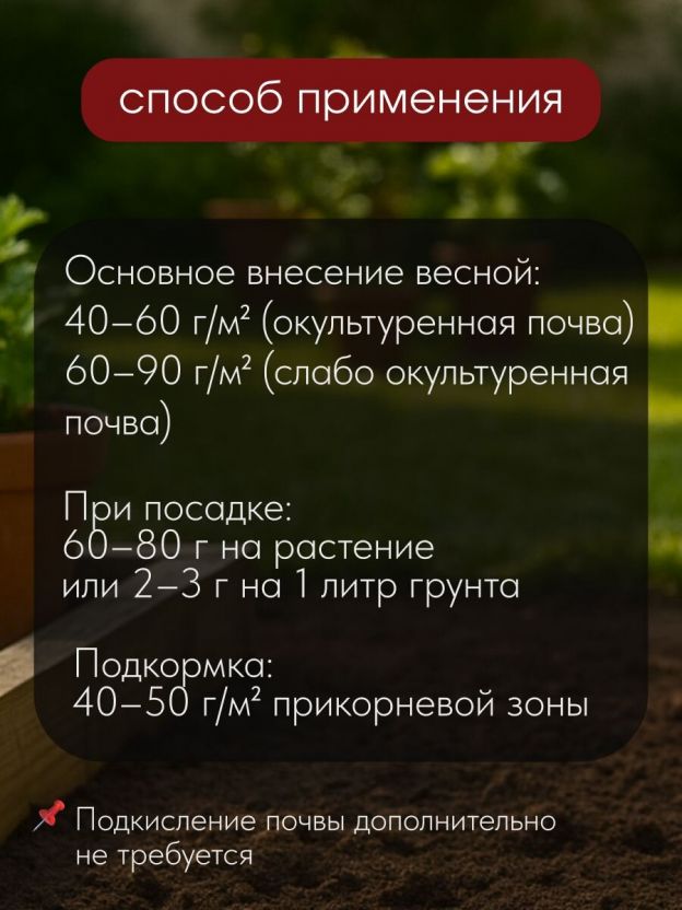 • Основное внесение при обработке почвы весной: 40-60 г/м2 - на окультуренных почвах и 60-90 г/м2 - на слабо окультуренных почвах.