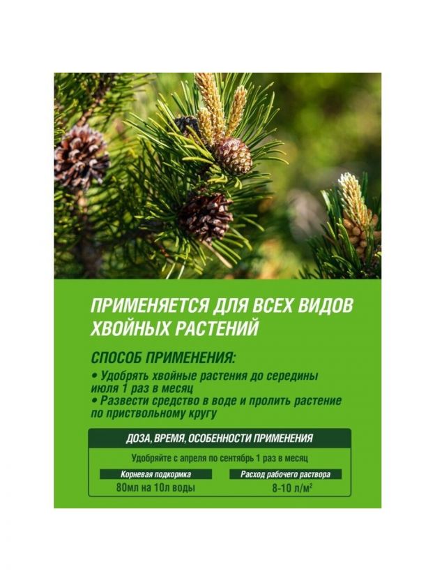 • Способствует восстановлению истощенной почвы, предотвращает старение хвои, повышает иммунитет растений.