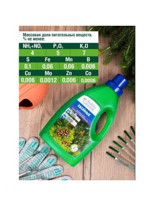 • В составе содержится полный комплекс питательных веществ, необходимых чтобы вернуть хвойным растениям здоровый зеленый цвет.