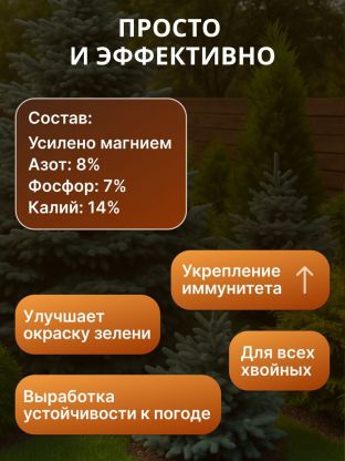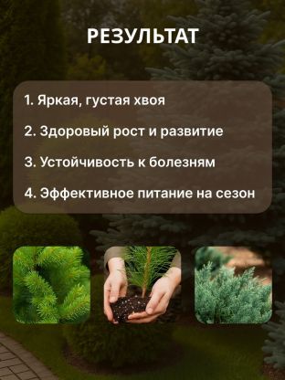 «Комплексное минеральное удобрение с микроэлементами для хвойных» разработано специально для растений, нуждающихся в кислой почве, таких как можжевельник, туя, кедр, ель, сосна, тис, лиственница, кипарисовик, пихта и других вечнозеленых декоративных культур.