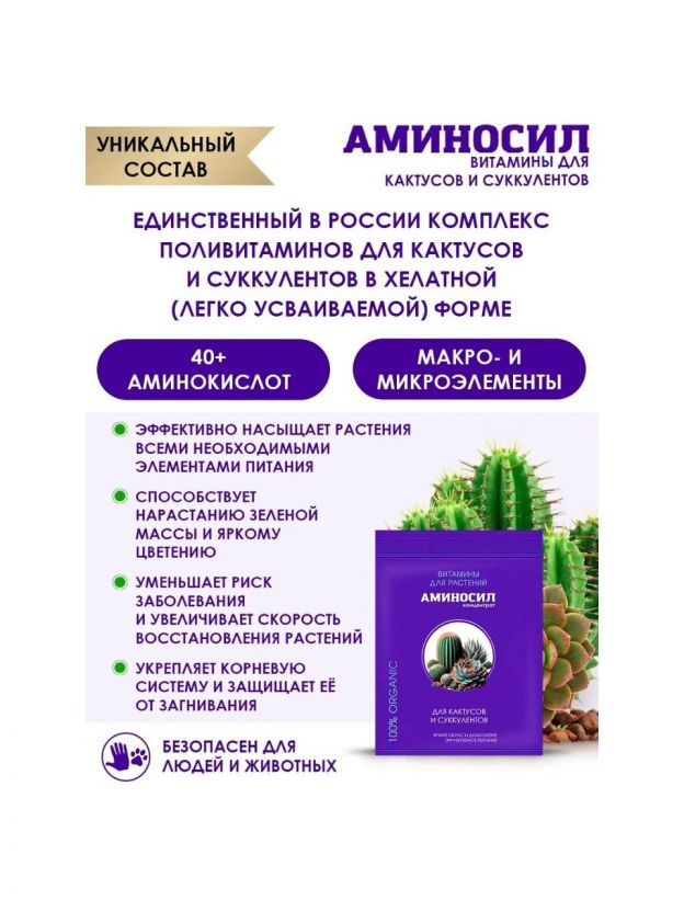 Ищете идеальное решение для роста кактусов и суккулентов? Удобрение "Аминосил" - концентрат, который обеспечит вашим растениям необходимый уход. Это органическое удобрение в жидкой форме стимулирует рост и подходит для использования в весенний, летний и осенний сезоны.