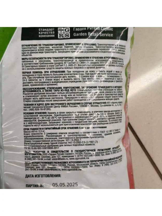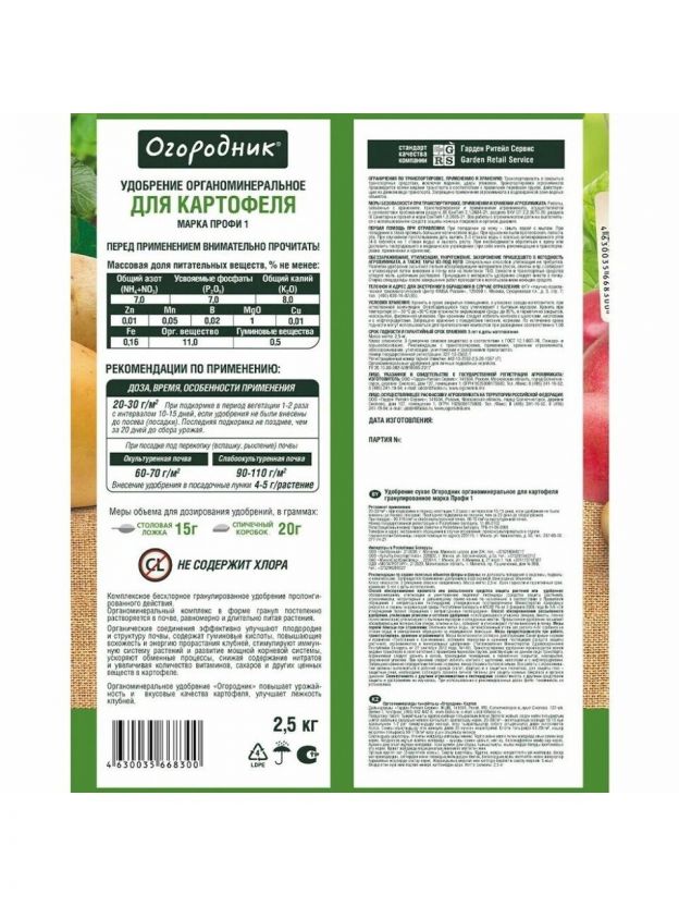 Удобрение для картофеля, органоминеральное, гранулы, 2.5 кг, Огородник