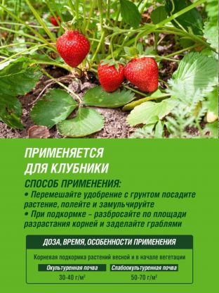 • Максимальный урожай: сбалансированный состав с микроэлементами для активного роста и обильного плодоношения клубники