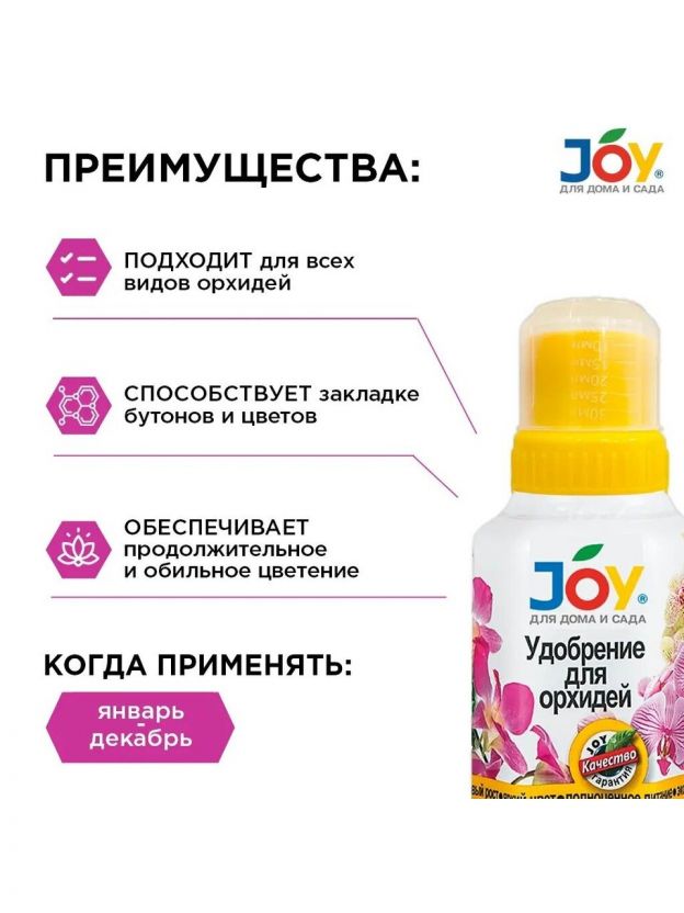 Жидкое удобрение Joy для орхидей содержит комплекс веществ, необходимый для полноценного питания в легкодоступной форме. Оно станет отличным помощником цветоводу и садоводу в выращивании всех видов орхидей.