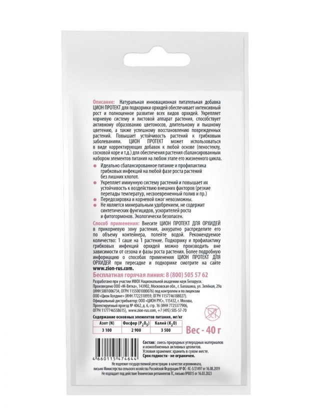 Удобрение для орхидей Protect Zion — здоровый рост и яркое цветение круглый год: минеральный субстрат в удобном саше, 40 г, для дома и дачи.