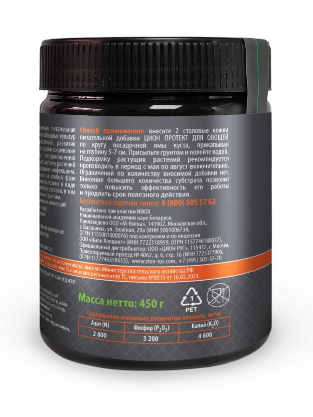 Минеральное удобрение для овощей Zion Protect 450 г — быстрый рост урожая, простая подкормка, экономия времени и сил на даче или дома.