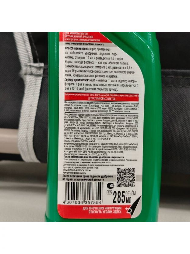 Внекорневая подкормка: отмерьте 5 мл и разведите в 1,5 л воды. Опрыскивайте поверхность листьев до полного смачивания, избегая попадания раствора на цветки.