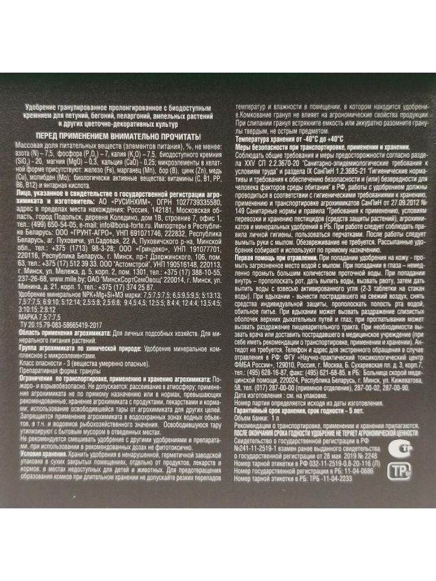 - Состав три основных макроэлемента (NPK): азот (N) 7.5%, фосфор (P2O5) 7%, калий (K2O) 7.5 %.