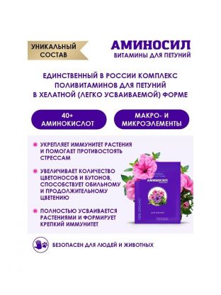 Ищете идеальное удобрение для пышного цветения петуний? Концентрат Аминосил объемом 5 мл станет вашим верным помощником в уходе за растениями. Разработанный специально для петуний, этот органический стимулятор способствует активному росту и обильному цветению, делая растения здоровыми и красивыми в течение всего сезона. Подходит для использования весной, летом и осенью.