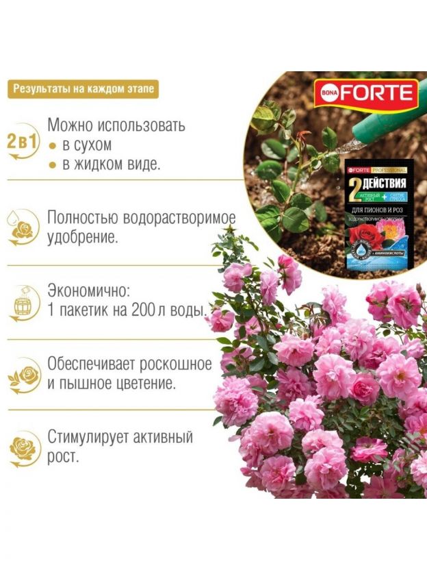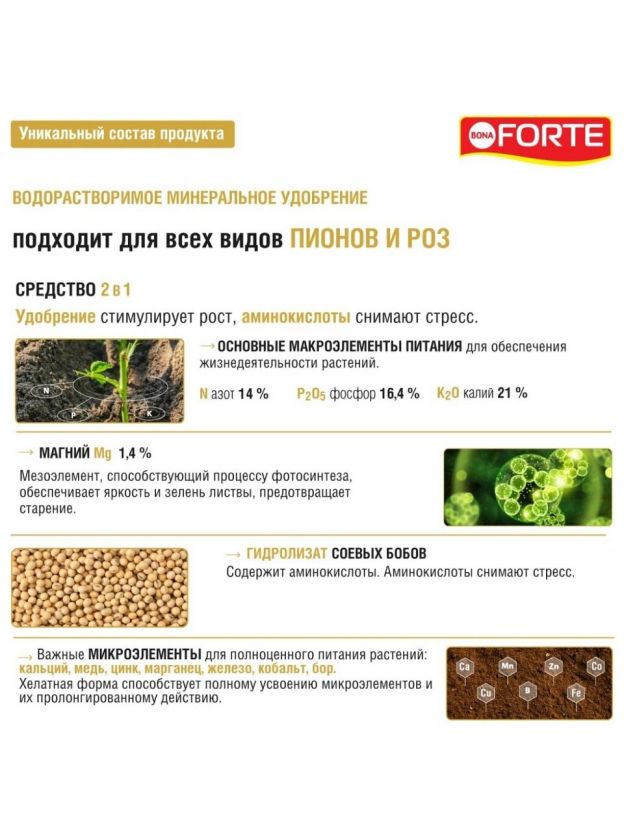 Водорастворимое удобрение подходит для всех видов пионов и роз. Способствует росту растений и пышному цветению. Способствует росту растений и повышает урожайность.