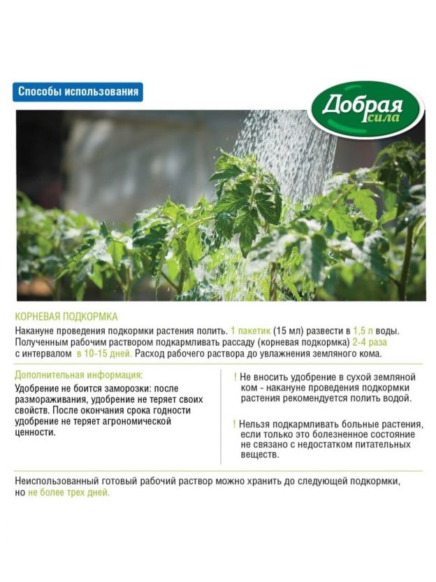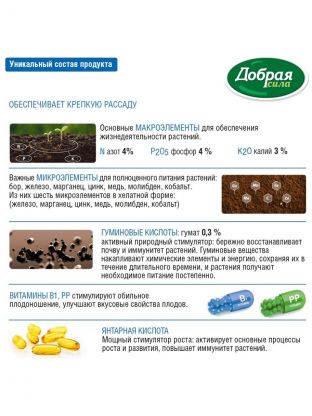Позаботьтесь о своей рассаде с удобрением "Добрая сила"! Это минеральное жидкое удобрение объемом 15 мл специально разработано для стимуляции роста растений в весенне-летний сезон. Идеально подходит для всех видов рассады, обеспечивая ей необходимую поддержку на всех этапах развития.