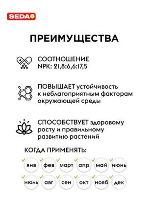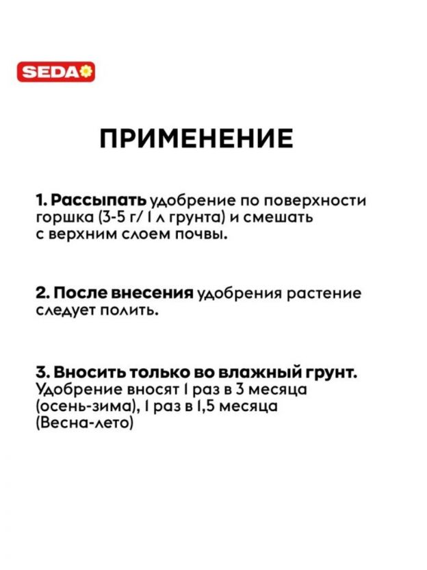Удобрение для роста, 80 г, Seda — эффективный минеральный стимулятор для комнатных растений. Гранулированная форма обеспечивает удобство применения и равномерное питание. Подходит для всех сезонов: весна, лето, осень, зима. Применение способствует ускоренному росту и укреплению растений, поддерживает их здоровье и декоративность круглый год. Выгода: быстрый и заметный результат без лишних хлопот.