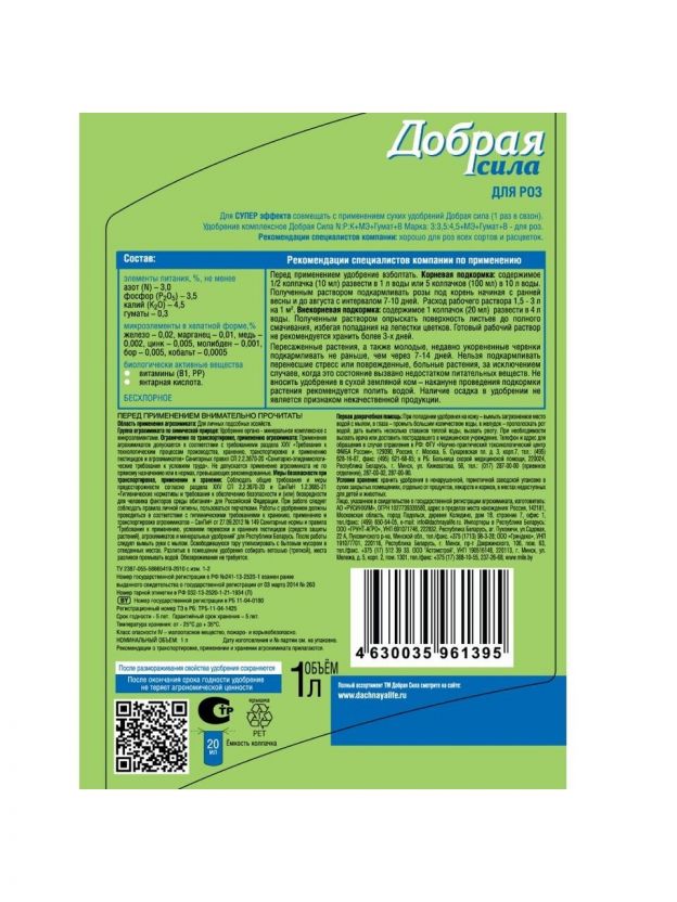 Удобрение для роз, органоминеральное, жидкость, 1 л, Добрая сила