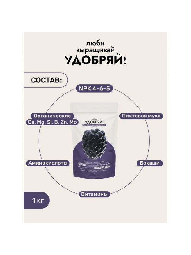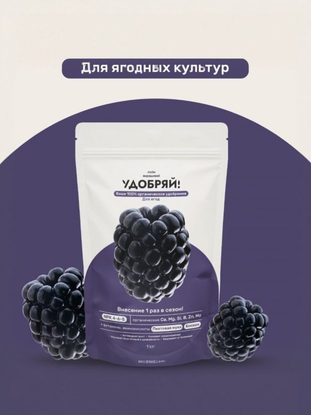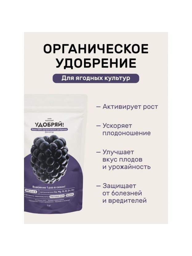 Удобрение для ягод Удобряй!, 1 кг — органическая добавка для активного роста и защиты ягодных культур круглый год. Быстрый результат, натуральный состав, экономия времени и урожая.