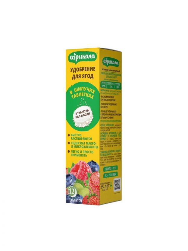 Удобрение для ягод Агрикола в виде шипучих таблеток — инновационное решение для быстрого и эффективного ухода за клубникой, малиной, смородиной и другими ягодами. Формула сбалансирована по макро- и микроэлементам, что обеспечивает активный рост, крепкий иммунитет растений и повышение урожайности. Растворяется в воде за считанные минуты, подходит для полива и опрыскивания, что особенно удобно для начинающих садоводов и опытных огородников.