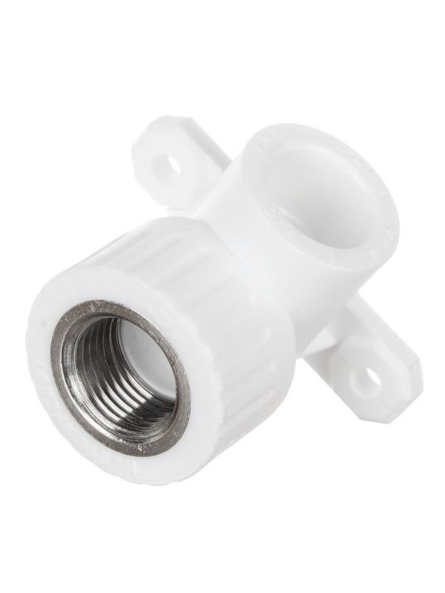 Уголок с креплением РосТурПласт d20х3/4" из полипропилена с латунной вставкой выдерживает до 95°C и 25 бар, подходит для горячего и холодного водоснабжения.