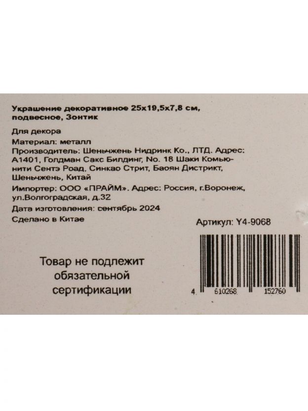 Украшение декоративное 25х19.5х7.8 см, подвесное, Зонтик, Y4-9068