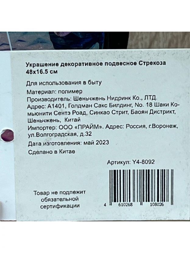 Украшение декоративное 48х16.5 см, подвесное, Стрекоза, Y4-8092