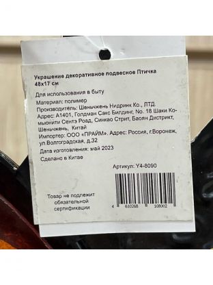 Украшение декоративное 48х17 см, подвесное, Птичка, Y4-8090