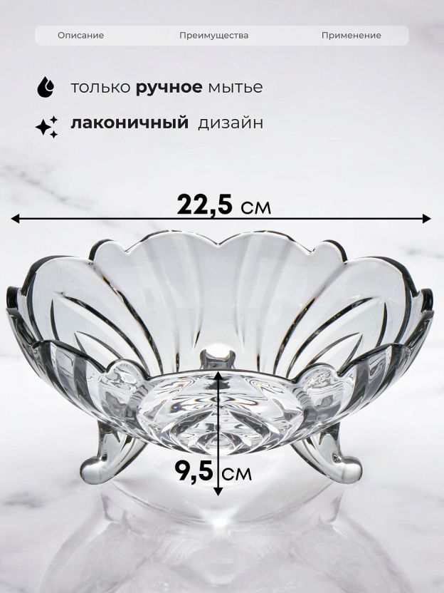 Красивая элегантная ваза для фруктов будет украшением любого обеденного стола. Стекло, из которого изготовлена конфетница, делает ее долговечной в повседневном использовании.