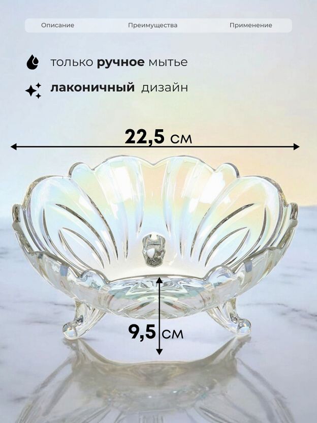 Обратите внимание на материал (стекло не впитывает запахи), размеры (9,5 см высота, 22,5 см диаметр) и отсутствие крышки — это классический вариант для быстрой подачи и хранения фруктов на столе.