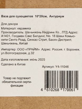 Какой размер у вазы для сухоцветов «Антуриум»?